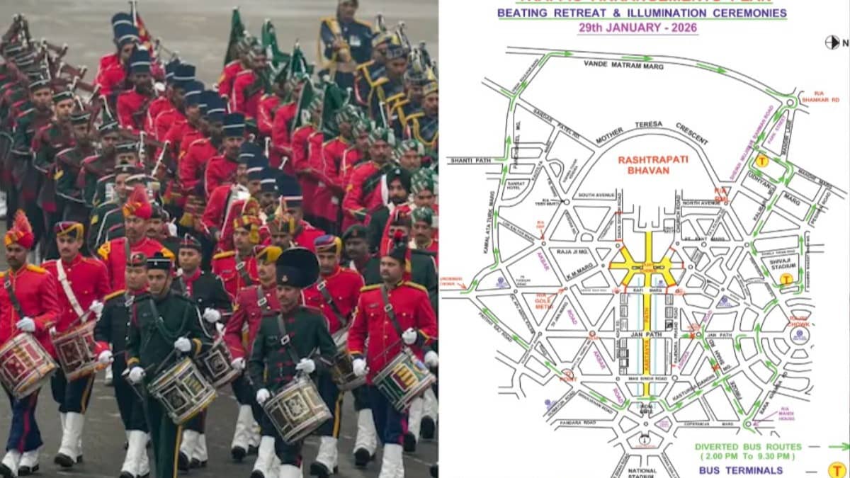 दिल्ली में बीटिंग रिट्रीट समारोह के चलते ट्रैफिक, मेट्रो और बसों के रूट में बदलाव किया गया है। जानें कौनसे रास्ते बंद है, समारोह में जाने के लिए पार्किंग कहां करें और कौन से 2 मेट्रो स्टेशन बंद रहेंगे।