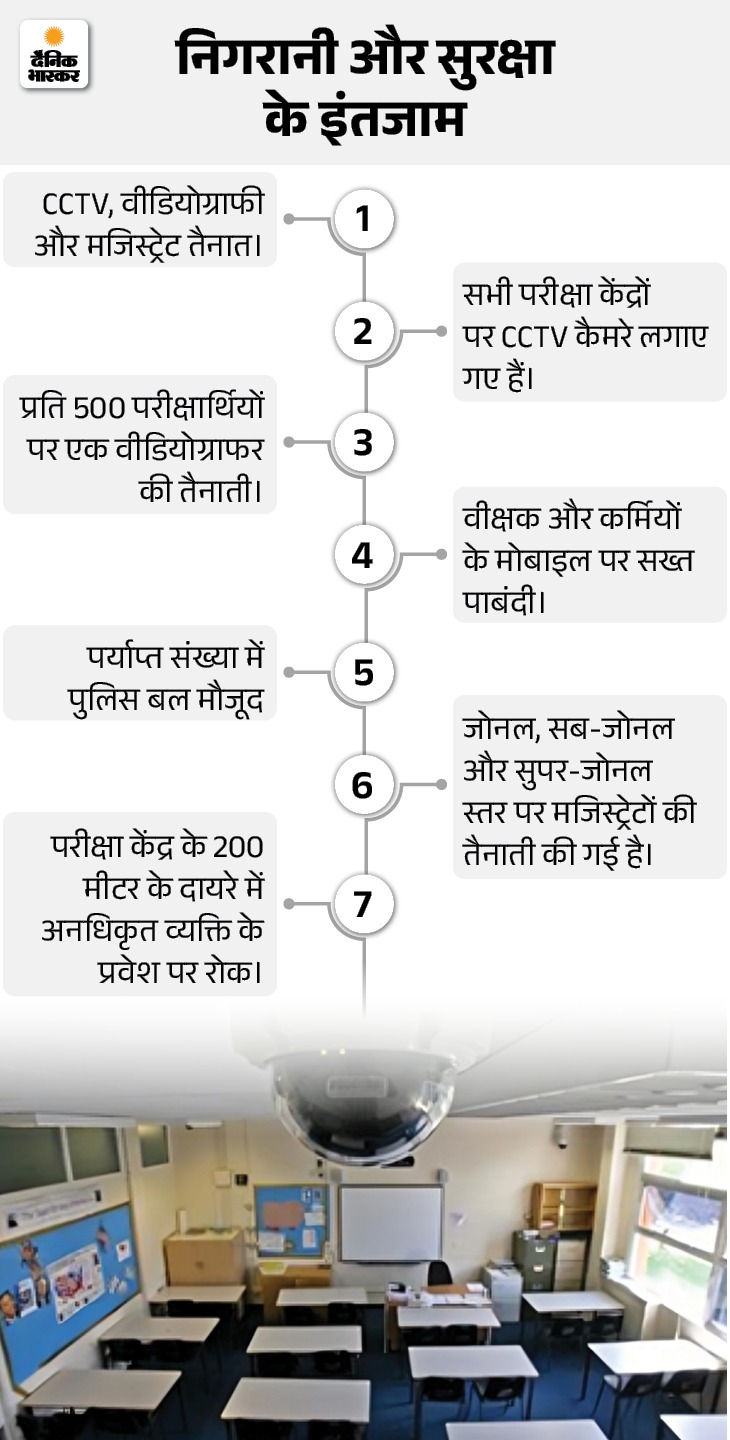 परीक्षा केंद्रों पर सुरक्षा व्यवस्था के कड़े इंतजाम किए गए हैं। सभी केंद्रों पर दंडाधिकारियों और पुलिस बल की तैनाती की गई है, साथ ही सीसीटीवी कैमरों से लगातार निगरानी की जा रही है। निर्धारित समय के बाद किसी भी परीक्षार्थी या परीक्षाकर्मी को केंद्र में प्रवेश की अनुमति नहीं दी जा रही है।