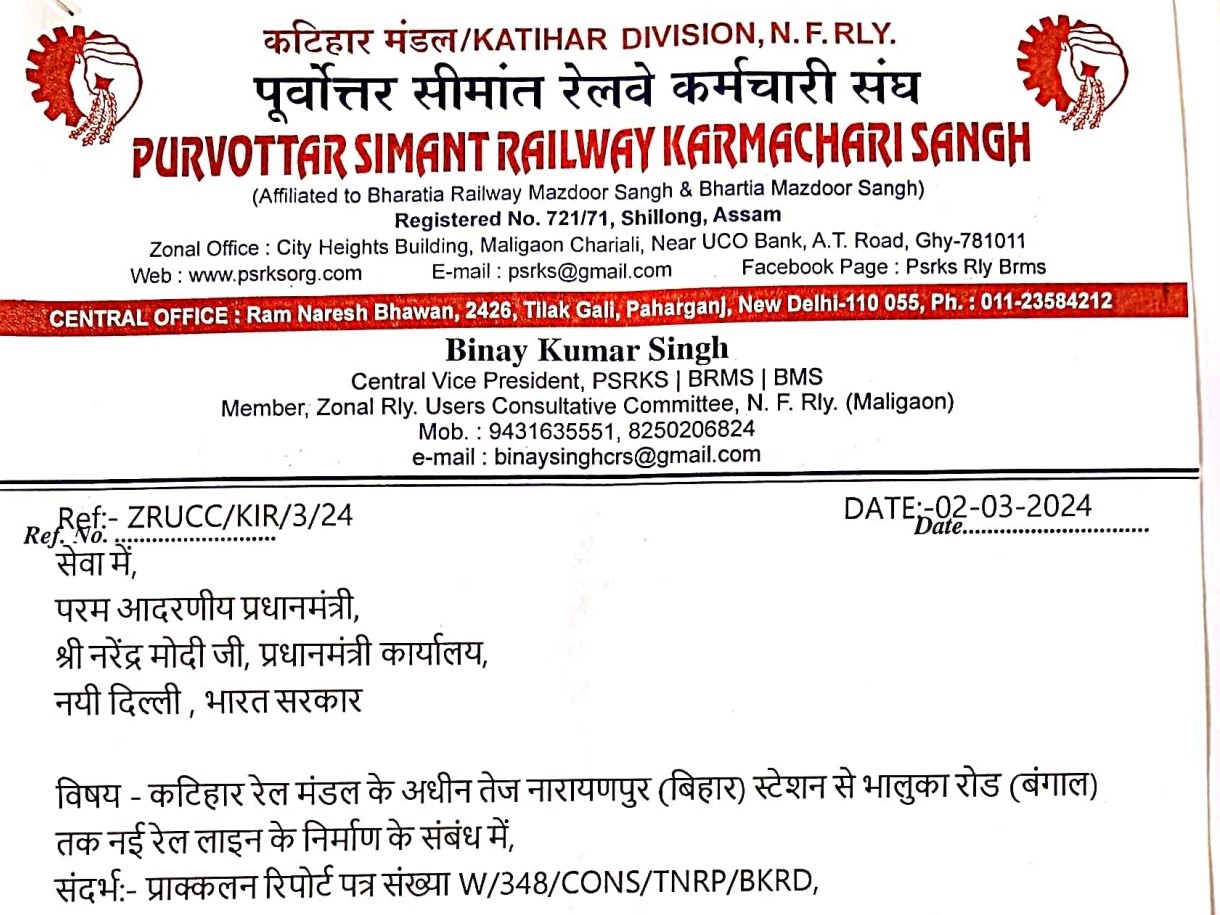 विनय कुमार सिंह ने अपने पत्र में बताया कि तेज नारायणपुर स्टेशन कटिहार जंक्शन से 25 किलोमीटर दूर मनिहारी अनुमंडल से सटा हुआ है। यह क्षेत्र लंबे समय से बेहतर रेल कनेक्टिविटी की मांग कर रहा है।